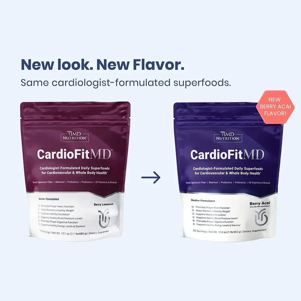 CardioFitMD® is the ultimate all-in-one, doctor-formulated drink, now available in a refreshing NEW Berry Açaí flavor with just the right amount of sweetness. Packed with superfoods for essential daily nutritional support, this delicious blend features a potent daily dose of beetroot, a broad-spectrum insoluble and soluble fiber and prebiotics blend, Bacillus coagulans probiotic, and 19 key vitamins and minerals. Just one scoop of this nutrient-rich, vegan drink helps support cardiovascular, circulatory, immune, and digestive health while promoting healthy weight management, stamina, and energy—perfect for a vibrant, active lifestyle.*