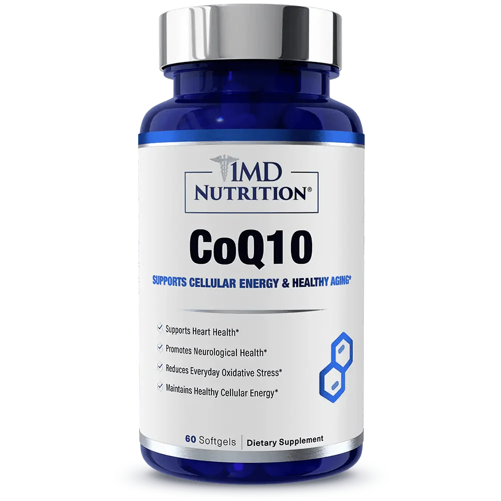 1MD Nutrition’s CoQ10 is formulated to promote healthy aging processes and provide support for cellular energy. Although CoQ10 is naturally present in the body, it decreases in aging. As a dietary supplement, 1MD Nutrition’s CoQ10 supports the body by promoting energy production, antioxidant activity, blood flow, and skin health.