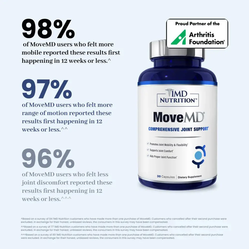 Everyday movement shouldn’t come with everyday discomfort. MoveMD® is the next generation of joint support—developed with rheumatologist insight and approved by the Arthritis Foundation—to help you stay active, agile, and comfortable.*